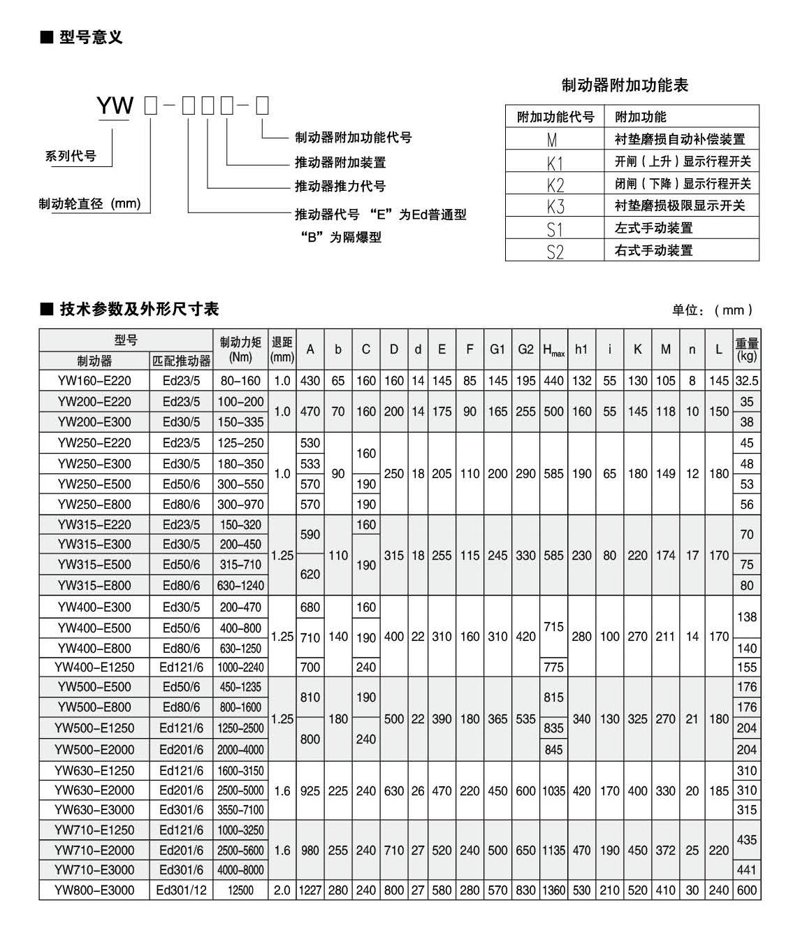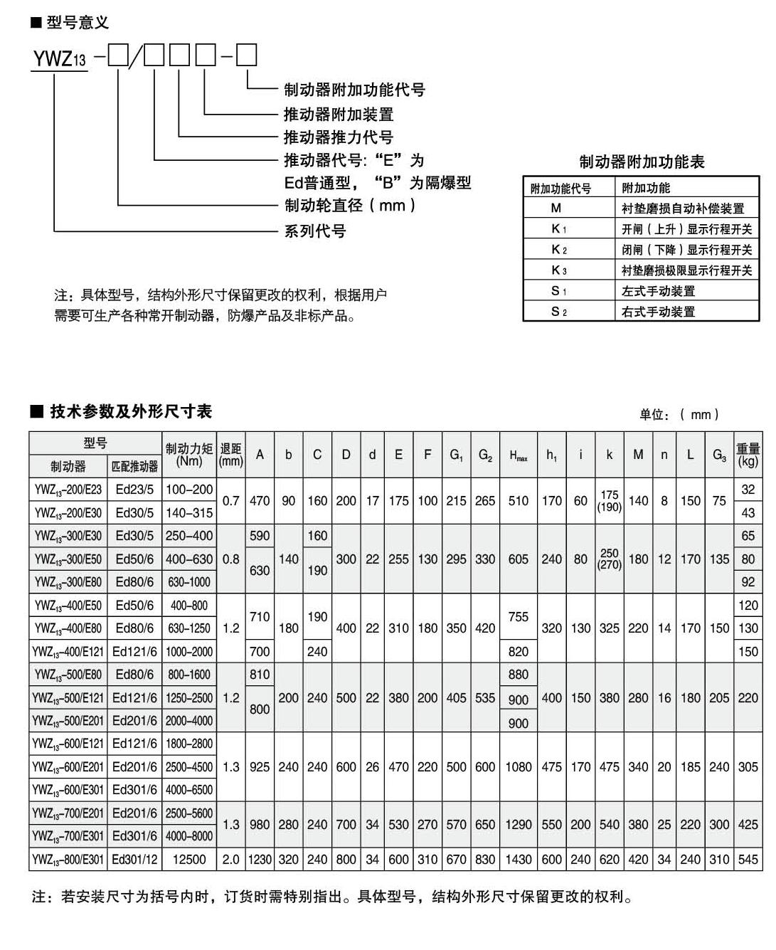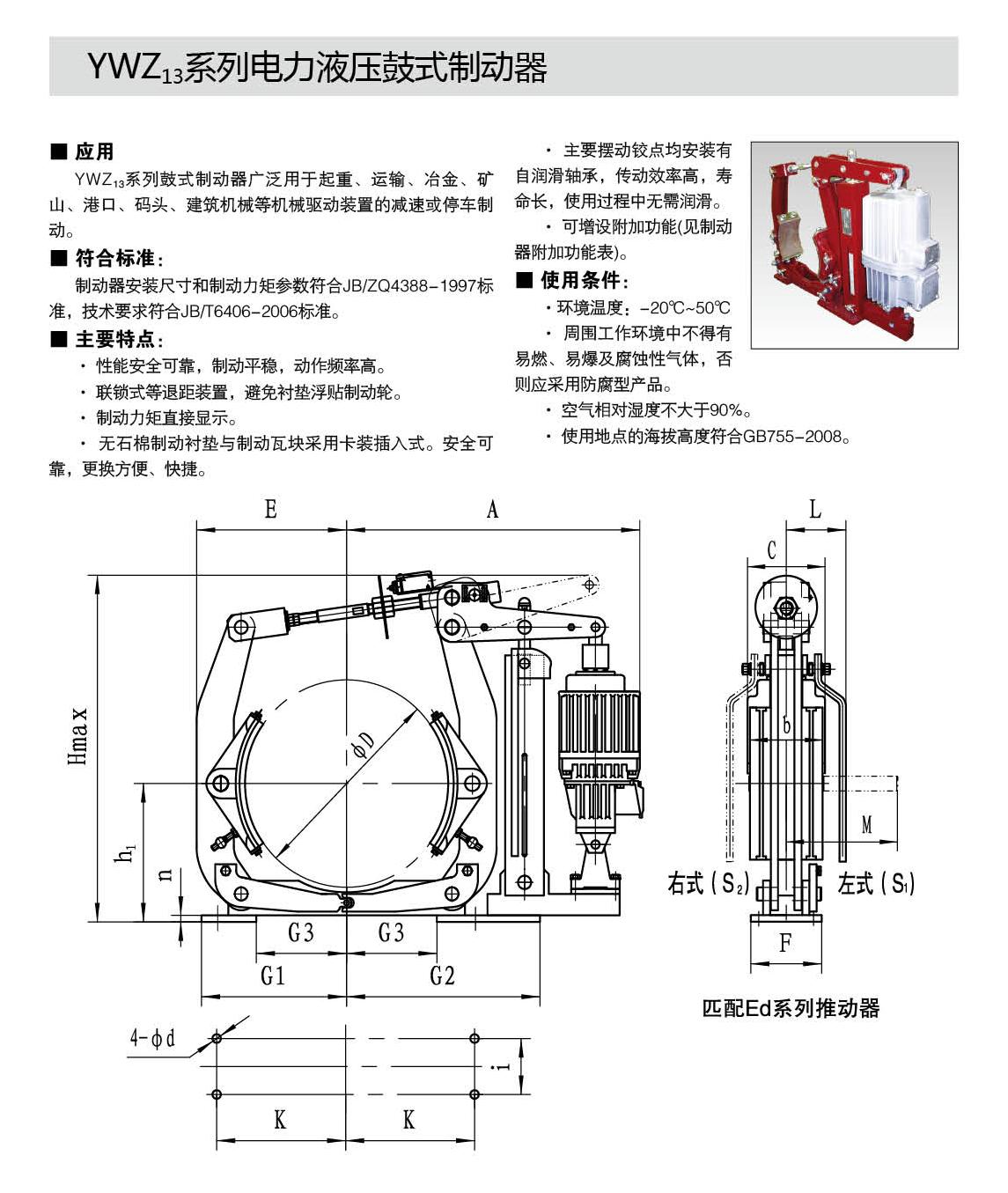 YW,YWZ13系列電力液壓鼓式制動器的連接尺寸和技術要求符合JB / T6406-2006標準;制動力矩參數(shù)符合DIN15435標準,配套符合DIN15430標準的Ed系列推動器。